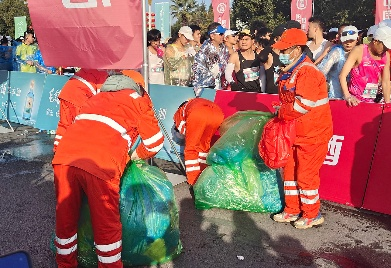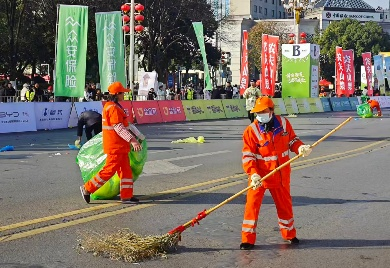 赛事当天,项目团队启动保障机制,依托现场指挥小组实行网格化动态调度。在卫生保洁方面,针对清晨及赛中人流高峰时段,采取“定人、定岗、定责”模式,安排54人定点值守、78人分段巡回保洁,重点快速清理遗落雨衣、纸杯等垃圾,确保环境实时洁净。现场还部署多支快速保障队与清运车队在指定点位备勤,配齐设备物资,以第一时间响应突发状况,全力保障赛事环境整洁有序。
