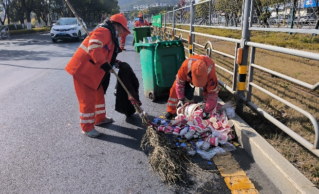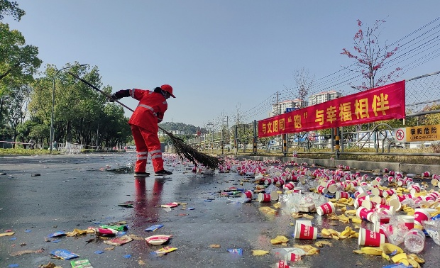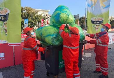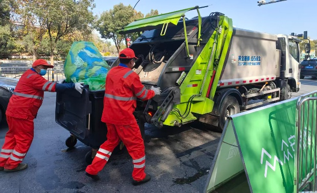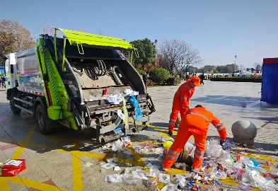 赛事结束后,项目团队立即转入赛后恢复作业模式,迅速开启“人机”协同,对赛道沿线遗留的纸杯、包装物等赛事垃圾进行集中清理、分类转运。累计清理200余处卫生死角,清运赛事垃圾约30余吨,并在1小时内还原道路洁净,以最快速度使城市环境与秩序回归常态。