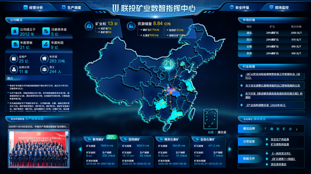 作为公司数字化转型的核心载体,“联投矿业数智指挥中心平台”集成系统融合、数据治理、动态监管三大核心功能,以统建数据中台与物联平台为技术支撑,全面汇聚矿山安全生产、矿石运输等场景的传感器实时数据,以及矿业总部ERP供应链系统、联投集团统建信息化系统等文本数据,通过标准化数据治理流程实现数据资源整合归一,并依托AI智能分析模型辅助企业精准经营决策。该平台的建成,实现了联投矿业总部对各出资公司矿山安全生产、矿石运输全流程的远程可视化监管,有效提升了对生产一线的精准管控效能。