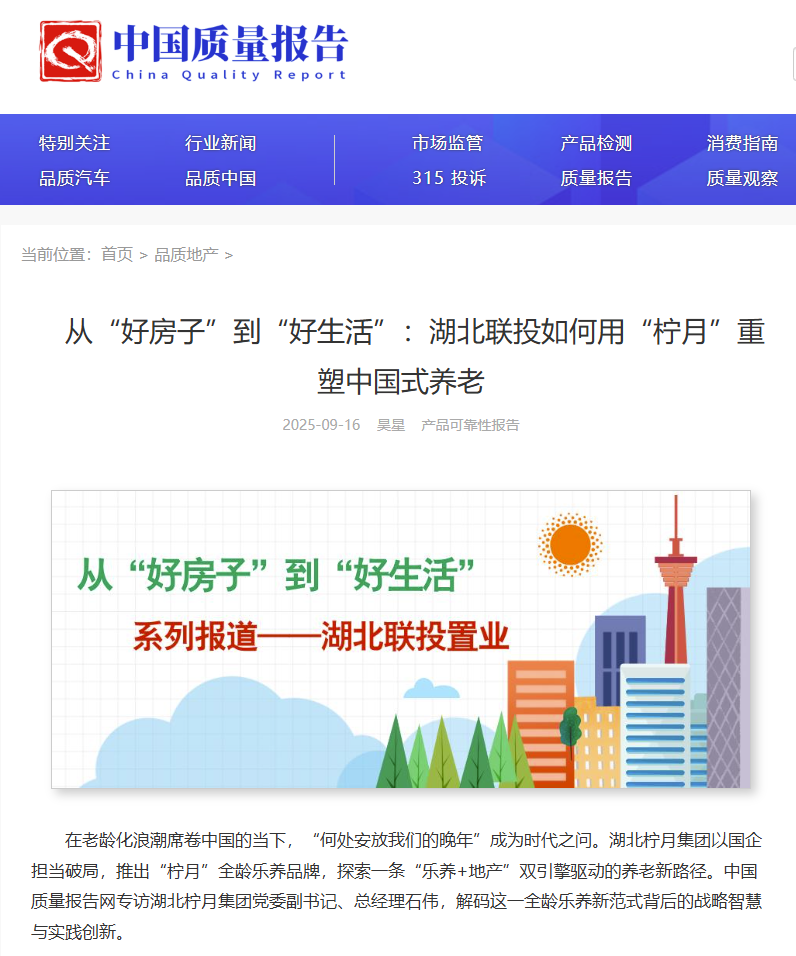 2025年,“好房子”首次被写入政府工作报道,银发经济成为战略发展重点。作为“城市更新全龄乐养生活营造商”,湖北柠月集团始终立足“好房子+好服务”,着力打造兼具适老居住功能与多元乐养体验的全龄乐养新生态。近日,中国质量报告网官方报道《从“好房子”到“好生活”:湖北联投如何用“柠月”重塑中国式养老》,讲述湖北柠月集团如何加速转型,通过“乐养+地产”的双引擎驱动模式,创新打造 “柠月” 全龄乐养品牌,为中国现代化养老提供新范式,助推银发经济高质量发展。以下为报道转载原文:
