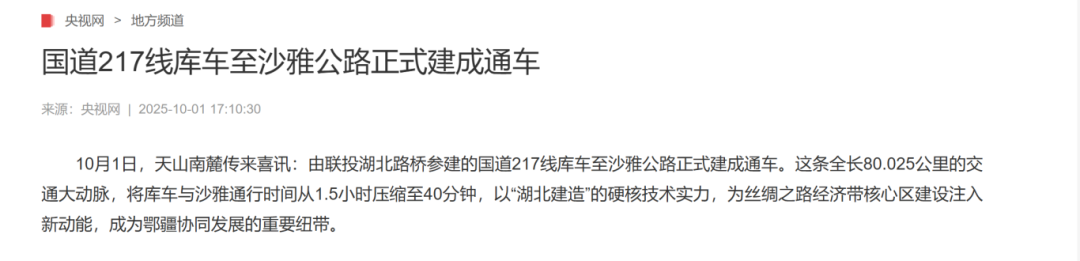 10月1日,天山南麓传来喜讯:由联投湖北路桥参建的国道217线库车至沙雅公路正式建成通车。这条全长80.025公里的交通大动脉,将库车与沙雅通行时间从1.5小时压缩至40分钟,以“湖北建造”的硬核技术实力,为丝绸之路经济带核心区建设注入新动能,成为鄂疆协同发展的重要纽带。
