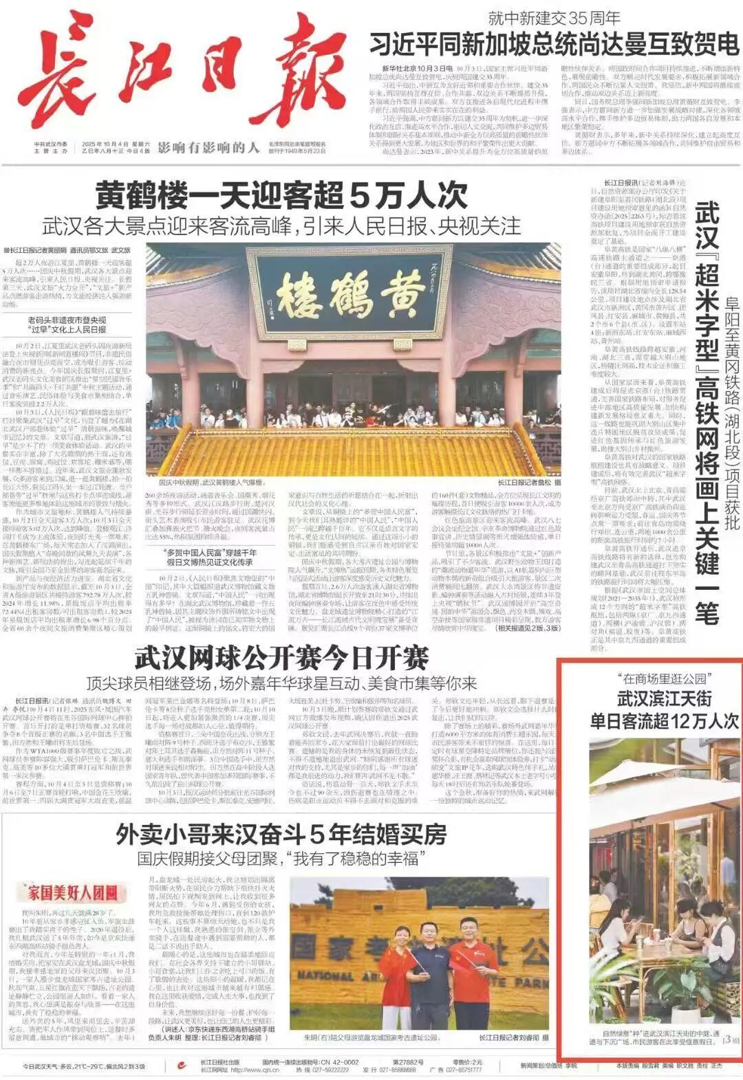 10月4日,长江日报头版刊发《“在商场里逛公园” ,武汉滨江天街单日客流超12万人次》一文,介绍湖北联投清能集团与龙湖集团联袂打造的武汉滨江天街国庆假期盛况。作为武汉首个自带1.3万平方米绿地公园的商业综合体,其融合自然景观与商业,成为市民休闲消费新选择。以下为报道全文: